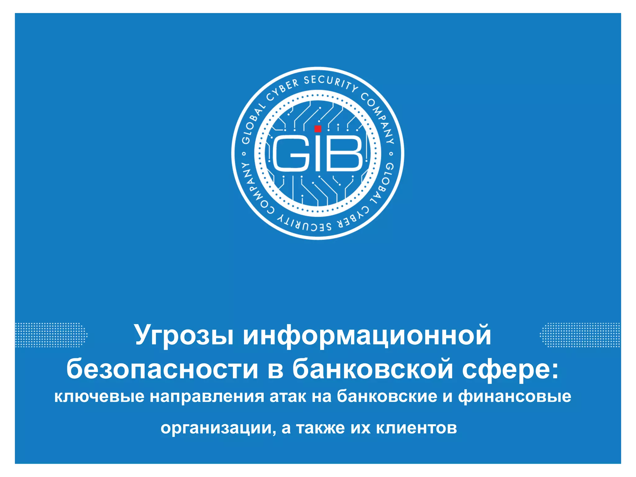 Документ анализирует угрозы информационной безопасности в банковской сфере, включая ключевые направления атак и современные киберугрозы, такие как APT-атаки. Он также описывает деятельность компании group-ib, специализирующейся на предотвращении и расследовании киберпреступлений, а также illustrates примеры успешных расследований среди организованных групп хакеров. Основная проблема заключается в недостаточной защите как со стороны банков, так и клиентов, что требует комплексного подхода к обеспечению безопасности.