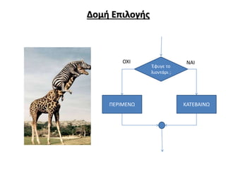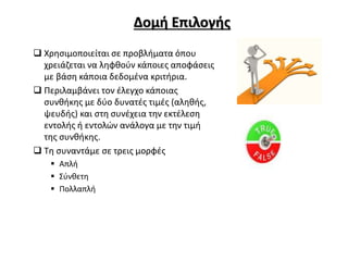 Διαφάνειες για την διδασκαλία της απλής και σύνθετης δομής επιλογής. Το εκπαιδευτικό υλικό δημιουργήθηκε για να υποστηρίξει το δεύτερο φύλλο εργασίας διδακτικού σεναρίου στο μάθημα Αρχές Προγραμματισμού της Β' Τάξης του νέου Επαγγελματικού Λυκείου.