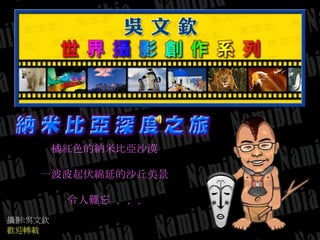 本文件描述了納米比亞沙漠的壯麗景色和獨特文化,包括獨立小屋飯店及希瑪族的傳統習俗。此外,還提到馬達加斯加的猴麵包樹和伊桃莎國家公園的動物生態,以及大西洋岸的海豹保護區。這些壯觀的自然景象和文化特色為攝影愛好者提供了豐富的題材。