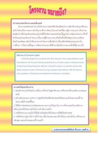 ความหมายของโครงงานคอมพิวเตอร์ โครงงานคอมพิวเตอร์ หมายถึงกิจกรรมการเรียนที่นักเรียนมีอิสระในการเลือกศึกษาปัญหาที่ตนเองสนใจ โดยจะต้องวางแผนการดาเนินงาน ศึกษา พัฒนาโปรแกรม โดยใช้ความรู้ทางกระบวนการวิศวกรรม ซอฟต์แวร์ เครื่องคอมพิวเตอร์และอุปกรณ์ที่เกี่ยวข้อง ตลอดจนทักษะพื้นฐานในการพัฒนาโครงงาน เรื่องที่ นักเรียนสนใจและคิดจะทาโครงงาน ซึ่งอาจมีผู้ศึกษามาก่อน หรือเป็นเรื่องที่นักพัฒนาโปรแกรมได้เคย ค้นคว้าและพัฒนาแล้ว นักเรียนสามารถทาโครงงานเรื่องดังกล่าวได้ แต่ต้องคิดดัดแปลงแนวทางใน การศึกษา การวิเคราะห์ข้อมูล การพัฒนาโปรแกรม หรือศึกษาเพิ่มเติมจากผลงานเดิมที่มีผู้รายงานไว้