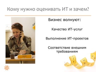 Документ описывает новый курс по измерению и оценке IT, ориентированный на бизнес и IT-менеджеров, которые хотят улучшить качество IT-услуг и управление проектами. В нем освещаются инструменты оценки, такие как ISO 15504, COBIT5 и ITIL, и приводятся методы для создания эффективной системы метрик и KPI. Курс включает практические занятия и направлен на развитие навыков в области оценки IT-процессов и их результативности.