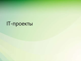 Документ представляет собой портфолио эксперта Вадима Гери, описывающее его опыт внедрения корпоративных информационных систем управления проектами на платформе Microsoft EPM для различных компаний. Включает информацию о разработке, обучении, техподдержке и методологии управления проектами, охватывающей управление строительными, внутренними и IT проектами. Приведены примеры работ с клиентами и их конкретные потребности.