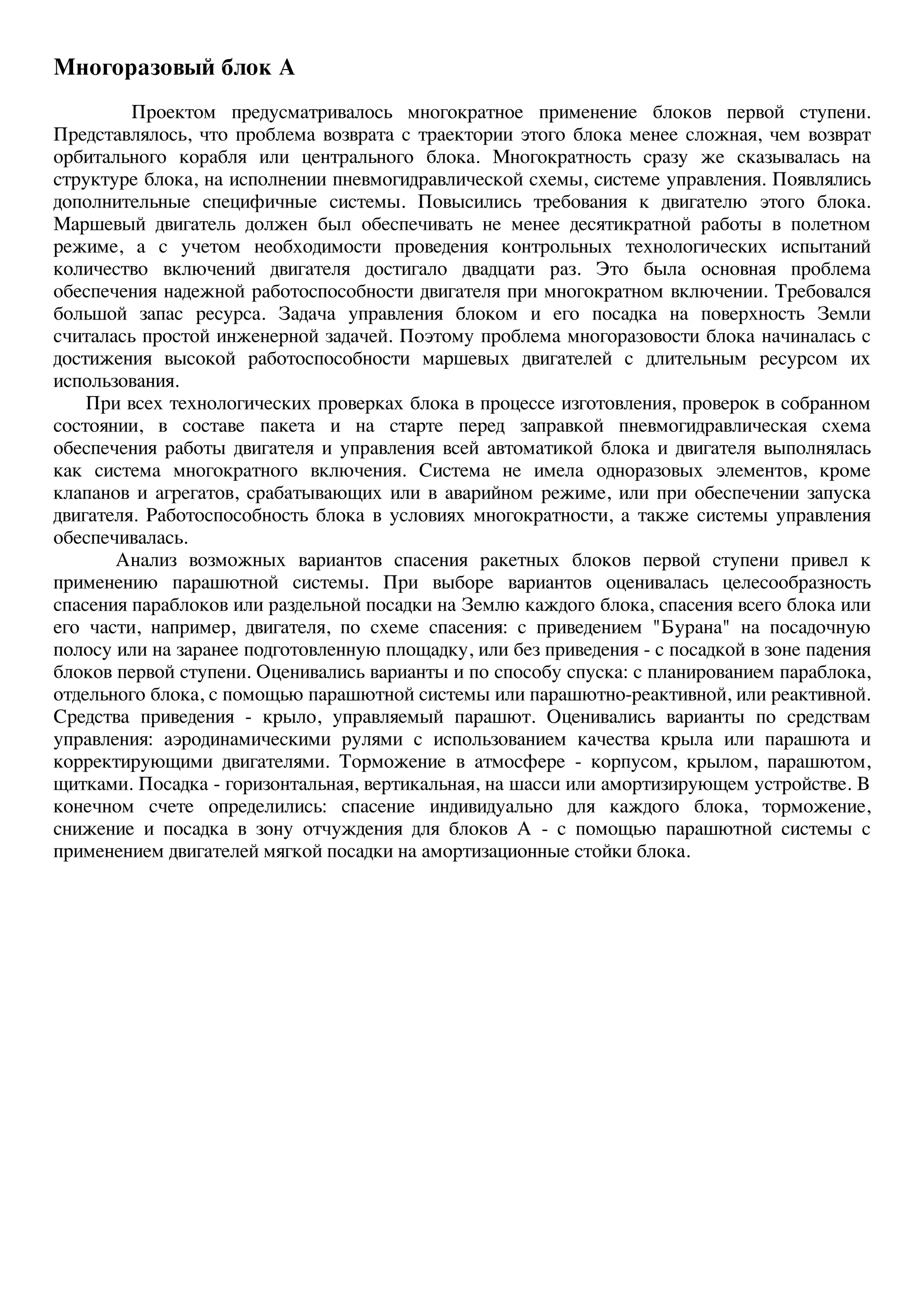 Документ описывает проектирование многоразового блока первой ступени ракеты, акцентируя внимание на разработке систем для его возврата на Землю. Основное внимание уделяется функциональности маршевых двигателей, механике многократных включений и вариациям спасательных систем, таким как парашютные устройства. Также обсуждаются сложности конструктивного обеспечения надежной работы блока и способы управления им в процессе посадки.