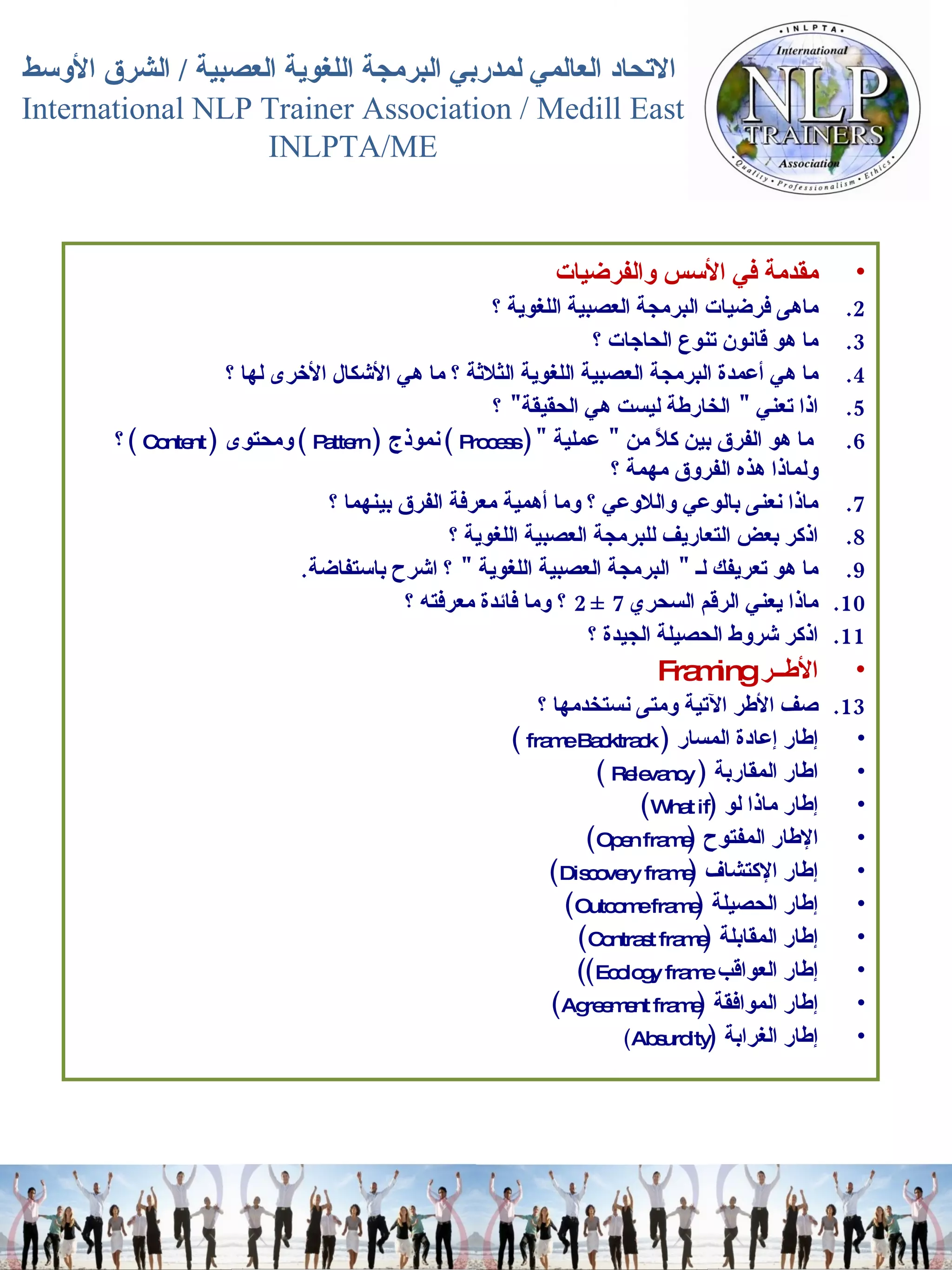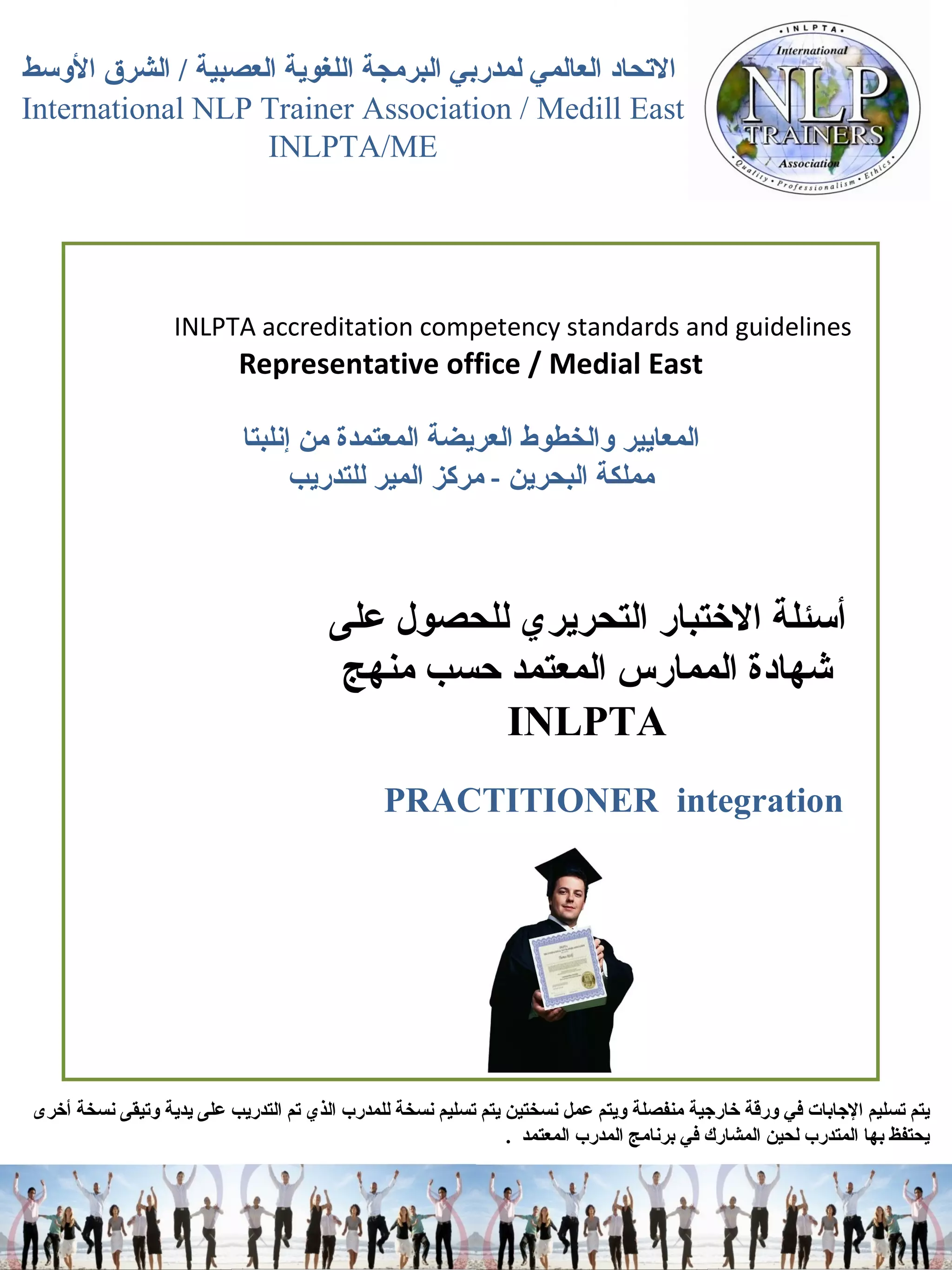 يتناول المستند معايير اعتماد وتقنيات البرمجة العصبية اللغوية (NLP) من منظور أنظمة التعليم وتدريب المدربين، ويستعرض أسئلة اختبار اجتياز شهادة الممارس المعتمد. كما يتضمن تفاصيل عن أفكار وتطبيقات مختلفة مثل نماذج ميلتون وميتا والتطبيقات العملية للسيطرة على الدولة الشعورية، بالإضافة إلى استراتيجيات المعايرة والإرساء. الوثيقة تهدف إلى تزويد المتدربين بالفهم الشامل والممارسات اللازمة لتطبيق تقنيات البرمجة العصبية بفعالية.