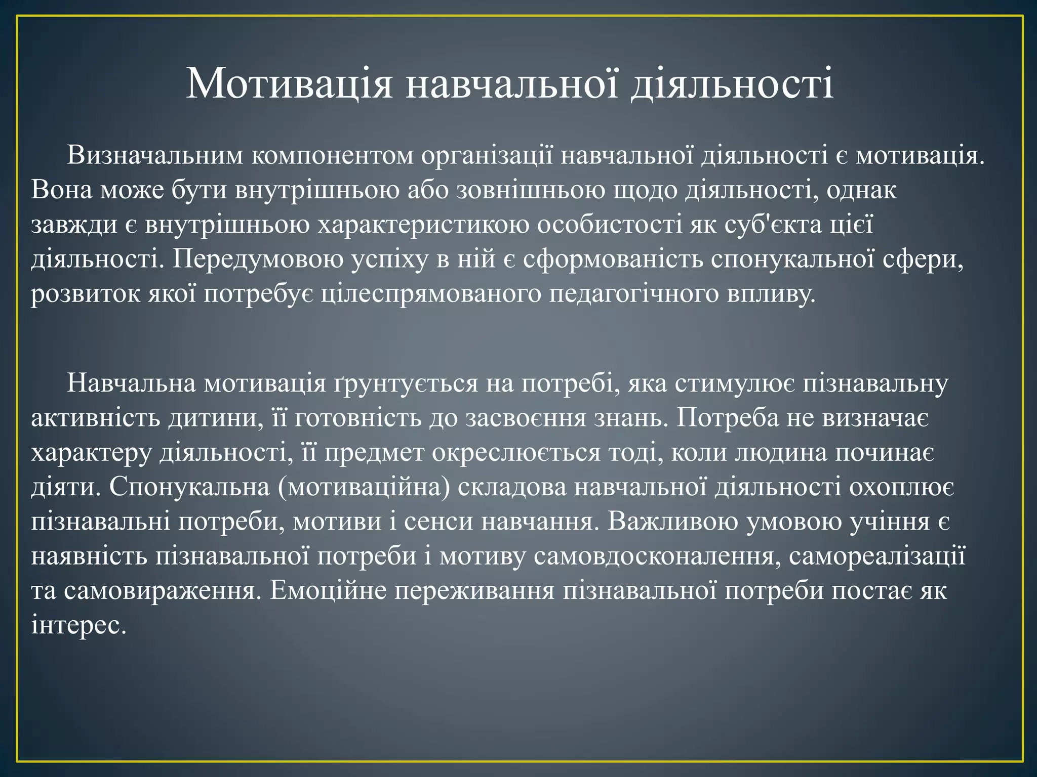 Навчальна мотивація ґрунтується на потребі, яка стимулює пізнавальну