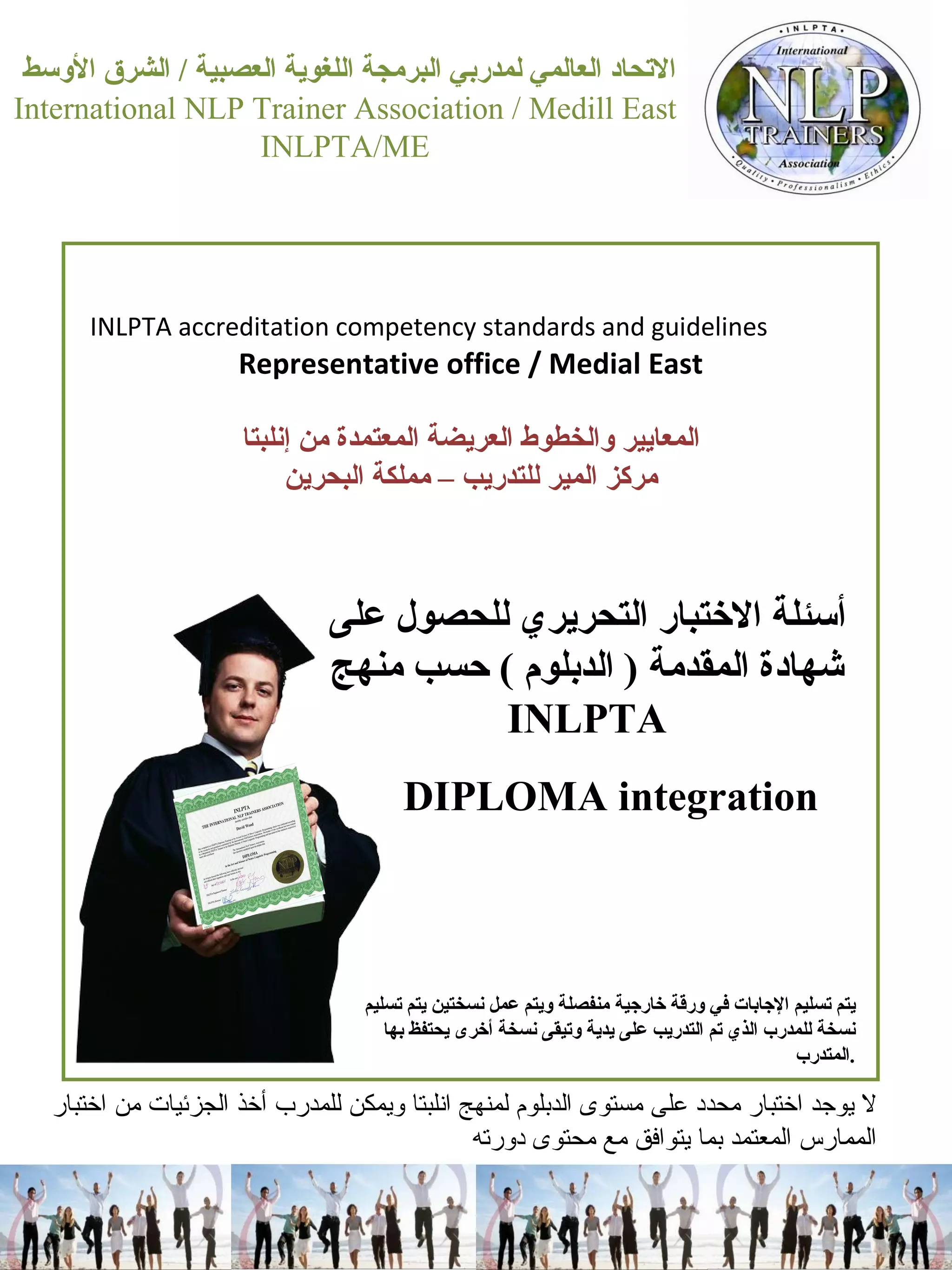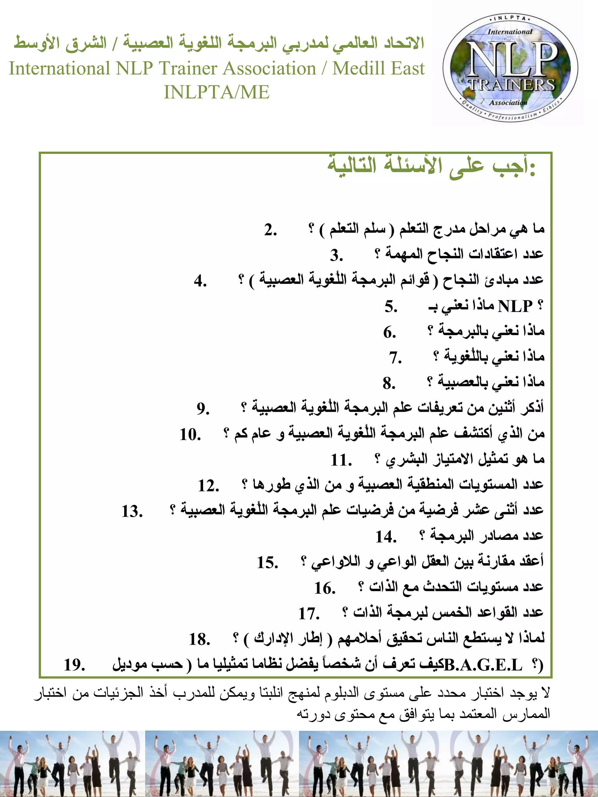 تتناول الوثيقة معايير وخطوط إرشاد الاعتماد من إنلبتا المتعلقة بشهادة الدبلوم في البرمجة اللغوية العصبية، وتحتوي على مجموعة من الأسئلة المتعلقة بمفاهيم NLP ومبادئ النجاح ومراحل التعلم. كما تطرح الوثيقة استفسارات حول التقنيات والأسس العامة في علم البرمجة، بالإضافة إلى أدوات التقييم والتقويم الذاتي التي يستخدمها المتدربون. تشمل الوثيقة أيضًا شرحًا لمكونات الاتصال الإنساني والنماذج المختلفة المستخدمة في فهم السلوكيات الإنسانية.