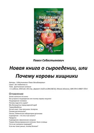 Книга Павла Себастьяновича рассматривает сыроедение как оптимальный способ питания, предусмотренный устройством человеческой пищеварительной системы. Автор делится личным опытом перехода на сыроедческую диету и утверждает, что такое питание помогает избежать болезней и поддерживать здоровье. В книге содержится информация о пищеварении, теории адекватного питания и практические рекомендации по переходу на сыроедение.