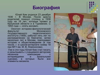 Юлий Ким, родившийся 23 декабря 1936 года в Москве, стал известным бардом и автором около пятисот песен, которые любимы многими поколениями. Он был активным участником правозащитного движения и получил ряд наград, включая премию имени Булата Окуджавы. Ким также является автором пьес и книг, ведет творческую деятельность между Москвой и Иерусалимом.