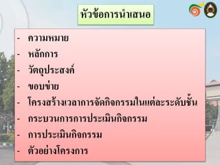 วัตถุประสงค์ - ขอบข่าย - โครงสร้างเวลาการจัดกิจกรรมในแต่ละระดับชั้น - กระบวนการการประเมินกิจกรรม - การประเมินกิจกรรม - ตัวอย่างโครงการ
