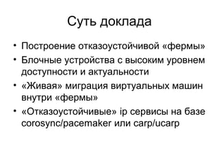 Доклад Виталия Гаврилова посвящен созданию отказоустойчивого микрокластера с помощью попарно соединенных физических серверов, описывая ключевые технологии и методы, такие как 'живая' миграция виртуальных машин и использование решений на базе corosync/pacemaker. Он включает детальную настройку сетевых интерфейсов, дискового пространства и файловой системы, а также методы мониторинга и автоматизации запуска виртуальных машин. Заключение подчеркивает преимущества и ограничения, связанные с отказоустойчивыми инфраструктурами.