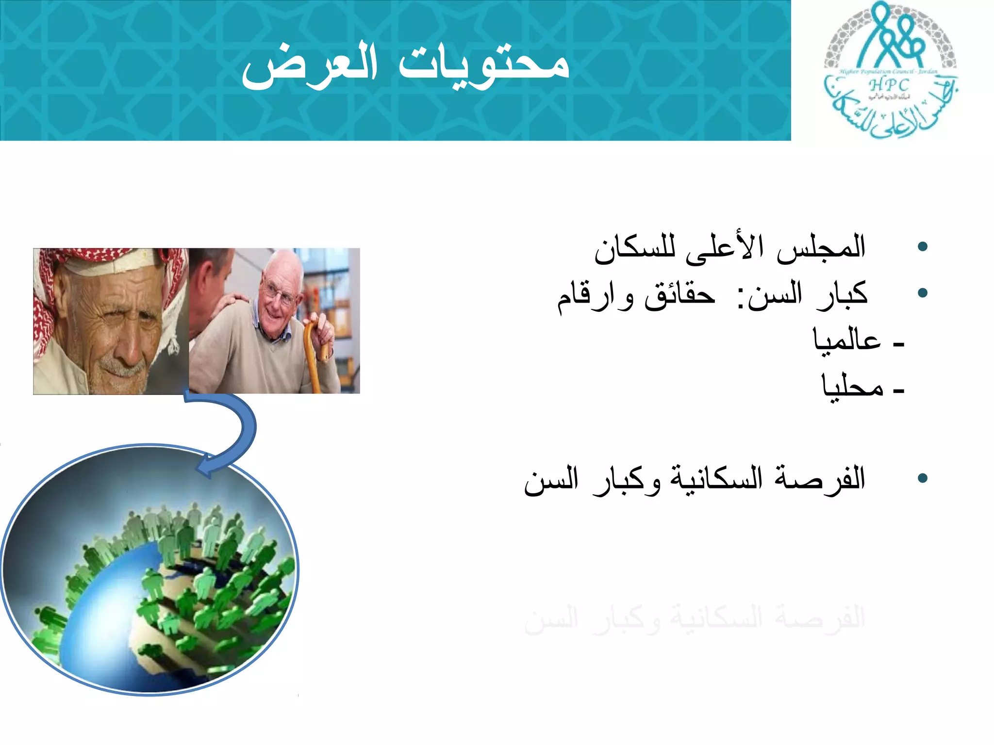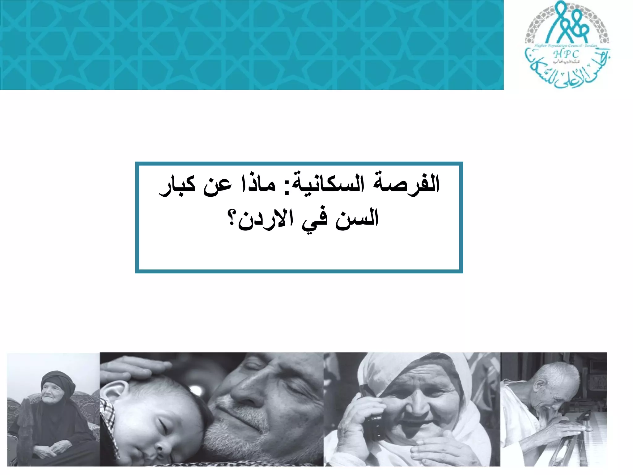 تستعرض الوثيقة بيانات حول كبار السن في الأردن وعالمياً، حيث يُتوقع أن يصل عددهم إلى مليار بحلول عام 2025. تشير إلى التحديات المرتبطة بالصحة والمعاشات لكبار السن وتوضح السياسات المتبعة في الأردن للحماية الاجتماعية. تعرض معلومات حول التحولات الديموغرافية والأثر المتوقع على المجتمع والاقتصاد.