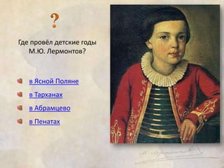 М.Ю. Лермонтов провел детство в усадьбе Тарханы, где получил домашнее образование и в возрасте 13 лет поступил в Московский университетский благородный пансион. Лермонтов также проявил способности к живописи и музыке, написав более 400 стихотворений и 3 романа, его творчество оказало значительное влияние на русскую литературу и музыку. Он стал известным благодаря своим произведениям, включая стихотворение 'Смерть поэта', написанное в ответ на смерть А.С. Пушкина.