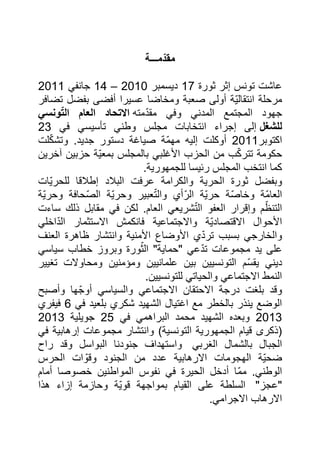 تناقش الوثيقة مرحلة الانتقال الديمقراطي في تونس بعد ثورة 2011، حيث أدت جهود المجتمع المدني إلى إجراء انتخابات تأسيسية وصياغة دستور جديد. رغم ذلك، واجهت البلاد تحديات اقتصادية وأمنية وزيادة في الاحتقان الاجتماعي. تم إنشاء مرصد نقابي لملاحظة الانتخابات بهدف ضمان نزاهة العملية الانتخابية وتدارك النقائص المسجلة.