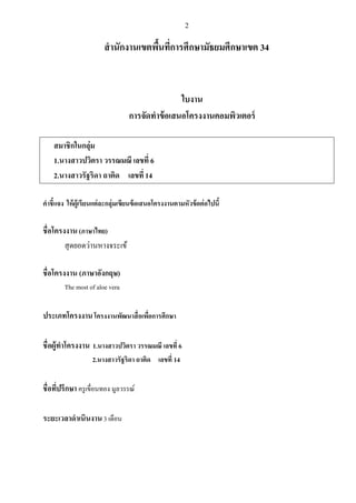 ใบงาน การจัดทาข้อเสนอโครงงานคอมพิวเตอร์ สมาชิกในกลุ่ม 1.นางสาวปวิตรา วรรณมณี เลขที่ 6 2.นางสาวรัฐริดา ถาติด เลขที่ 14 คาชี้แจง ให้ผู้เรียนแต่ละกลุ่มเขียนข้อเสนอโครงงานตามหัวข้อต่อไปนี้ ชื่อโครงงาน (ภาษาไทย) สุดยอดว่านหางจระเข้ ชื่อโครงงาน (ภาษาอังกฤษ) The most of aloe vera ประเภทโครงงาน โครงงานพัฒนาสื่อเพื่อการศึกษา ชื่อผู้ทาโครงงาน 1.นางสาวปวิตรา วรรณมณี เลขที่ 6 2.นางสาวรัฐริดา ถาติด เลขที่ 14 ชื่อที่ปรึกษา ครูเขื่อนทอง มูลวรรณ์ ระยะเวลาดาเนินงาน 3 เดือน