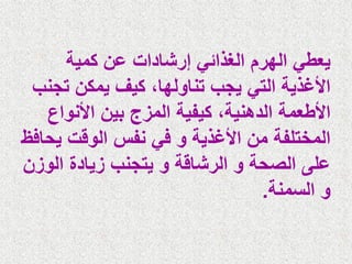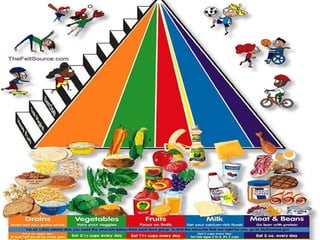 يتناول الوثيقة أهمية الهرم الغذائي في توجيه الأطفال نحو تناول الأطعمة الصحية والمتوازنة للحفاظ على صحتهم ورشاقتهم. يشمل الهرم مجموعة متنوعة من الأغذية مثل الحبوب والخضروات والفواكه والدهون واللحوم، وينصح بتناولها باعتدال. كما يؤكد على أهمية النشاط البدني وتجنب الأطعمة الدسمة والمقلية من أجل دعم النمو السليم للأطفال.