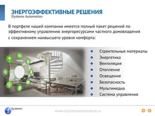 Документ представляет компанию iSystems Automation, которая предлагает инновационные решения для управления энергоресурсами в загородных домах, включая системы отопления, вентиляции, освещения и безопасности. Она обеспечивает полный цикл строительства, использует энергоэффективные технологии и предлагает интеграцию мультимедийных систем, а также индивидуальные системы управления. В документе также упоминается партнерство с Schneider Electric и широкий спектр решений для автономного энергоснабжения.
