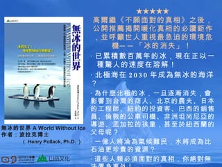 Chapter 4 「 暖化 Warming Up 」 大自然的最佳溫度計是冰,它可能是氣候變遷最敏感和最清楚的指示計。 冰只要變暖,就會融化。冰不會發問,不會爭論,不會讀報紙,不會聽辯論。 冰不會被意識形態所囚錮,在它跨過溶點,從固體變成液態時也沒有任何政治包袱。它只是默默融化。