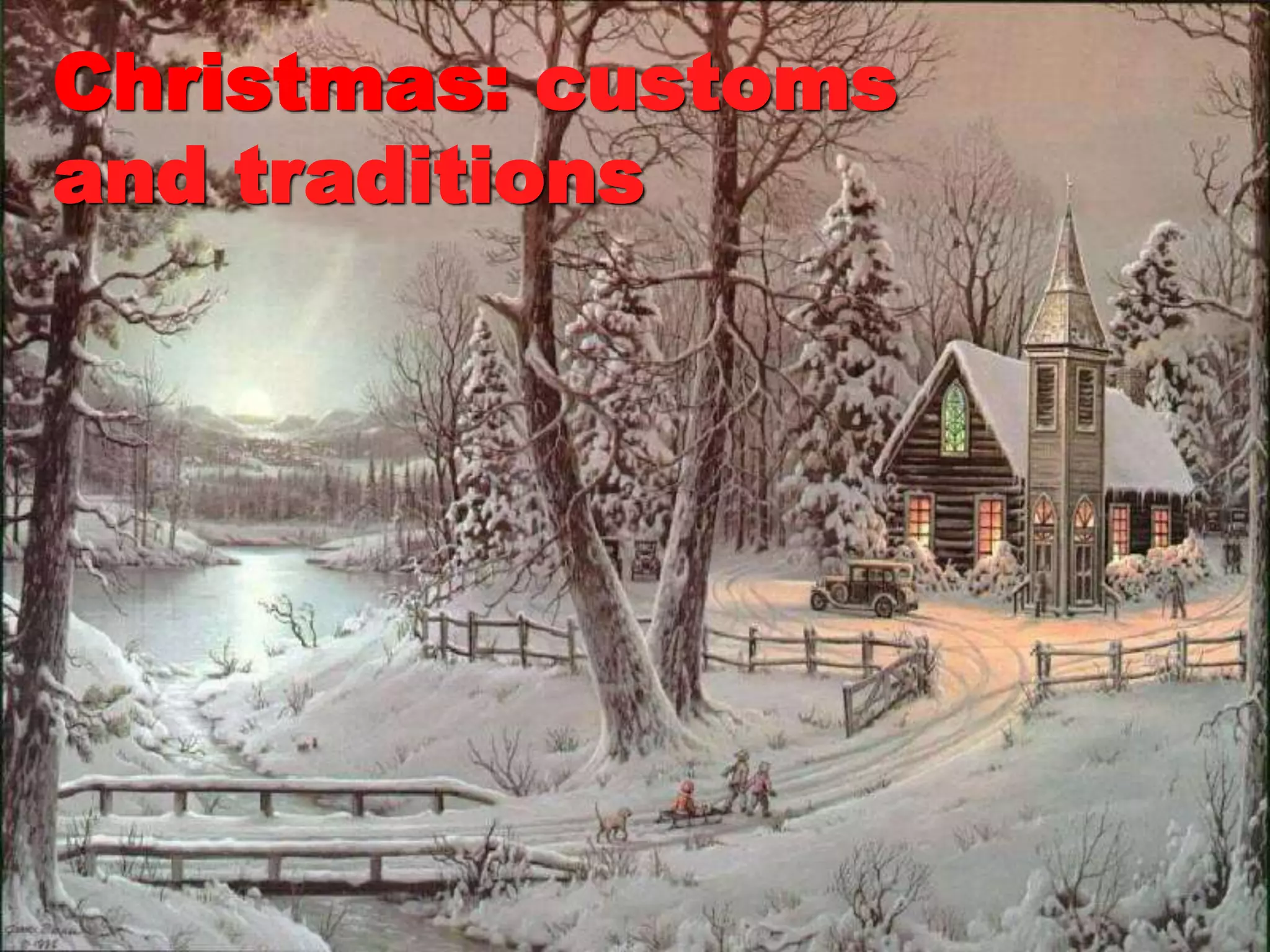 This document discusses various Christmas traditions and symbols. It provides information about typical Christmas meals like turkey and pudding. It also mentions common Christmas symbols such as Santa Claus, Christmas trees, and plants used in decorations. Additionally, it includes the lyrics to the song "Silent Night" and discusses the colors most associated with Christmas: red, white, and green.