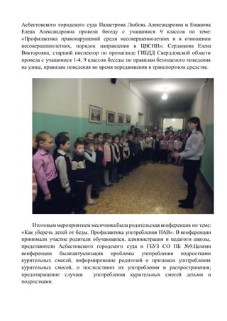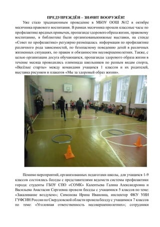 В октябре в школе проведён месячник правового воспитания, включающий классные часы, выставки и беседы с представителями профилактических ведомств. Основное внимание уделялось профилактике вредных привычек и правам несовершеннолетних, с финальной родительской конференцией о предупреждении употребления психоактивных веществ. Участники обсуждали важность доверительных отношений в семье и здорового образа жизни как способов предотвращения употребления наркотиков детьми.