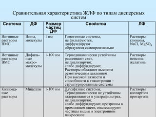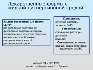 Документ обсуждает жидкие лекарственные формы (ЖЛФ), их классификацию, свойства и требования к составу, а также методы их получения и применения. Основные категории ЖЛФ включают истинные растворы, коллоидные растворы, суспензии и эмульсии, каждая из которых имеет свои физико-химические характеристики. Указаны общие требования к стабильности и качеству ЖЛФ, а также факторы, влияющие на их растворимость.