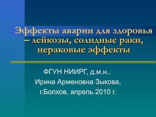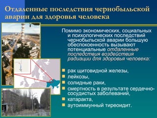 Документ обсуждает влияние Чернобыльской аварии на здоровье человека, подчеркивая различные виды заболеваний, включая рак, лейкоз и сердечно-сосудистые болезни. Исследования показывают неопределенные связи между облучением и заболеваемостью, особенно среди ликвидаторов аварии, и указывают на необходимость дальнейших исследований для получения более четких выводов. Также упоминаются эффекты на глаза, включая катаракту, у ликвидаторов и облученного населения.