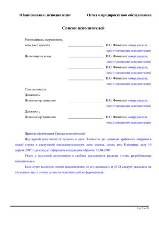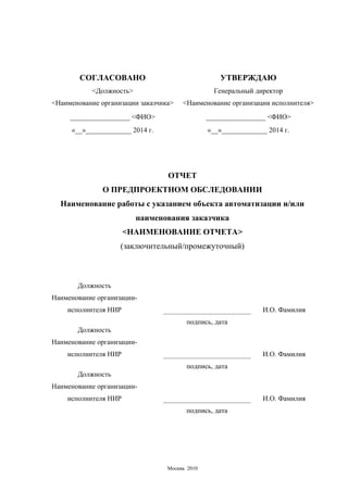 Документ представляет собой отчет о предпроектном обследовании, содержащий структурированную информацию об объекте автоматизации, бизнес-процессах и потребностях заинтересованных лиц. Он включает в себя цели и результаты обследования, выявленные проблемы и ограничения, а также концепцию системы и рекомендации по внедрению. Соблюдаются требования к оформлению документации и указания на использование нормативных ссылок и определений.