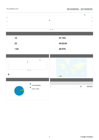 2010/05/20 - 2010/05/20 マイレポート 比較: サイト セッション 20 20 10 10 0 0 05月20日 サイトの利用状況 14 セッション 57.14% 直帰率 23 ページビュー 00:02:08 平均サイト滞在時間 1.64 平均ページビュー 28.57% 新規セッション率 ユーザー サマリー 地図上のデータ表示 ユーザー数 9 9 4 4 0 0 05月20日 ユーザー数 9 セッション 14 14 トラフィック サマリー コンテンツ サマリー 検索エンジン ページ ページビュー 割合 13.00 (92.86%) / 23 100.00% 参照サイト 1.00 (7.14%) 1 Google Analytics