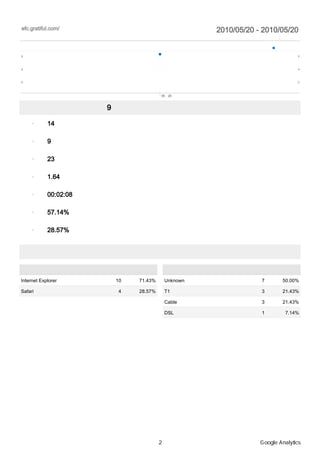 2010/05/20 - 2010/05/20 ユーザー サマリー 比較: サイト ユーザー数 9 9 4 4 0 0 05月20日 このサイトのビジター数 9 14 セッション 9 ユニークユーザー 23 ページビュー 1.64 平均ページビュー数 00:02:08 サイト滞在時間 57.14% 直帰率 28.57% 新規セッション率 ユーザー環境 ブラウザ セッション数 割合 接続速度 セッション数 割合 Internet Explorer 10 71.43% Unknown 7 50.00% Safari 4 28.57% T1 3 21.43% Cable 3 21.43% DSL 1 7.14% 2 Google Analytics