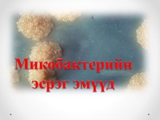 Сүрьеэгийн үүсгэгч • 0,2-0,6 41,0-10,0 мкм хэмжээтэй дүрсний хувьд олон төрөлтэй (зууван жижиг олон ирмэгтэй L- хэлбэртэй) байдаг. • Морфологийн хувьд • Нийлмэл бүтэцтэй (уураг, өөх тос нүүрс ус, урдэс бодис, ус )байдаг. • Өөх тос , царцдаг тос ихээр агуулдаг учир гадны нөлөөнд өндөр тэсвэртэй. Хүчил, суурь, спирт маш бага нөлөөлнө. • СМБ-н нэг онцлог нь олон төрлийн нөхцөлд дасан зохицох чадвартай. • Макрофаг эсийн дотор шимэгчлэн амьдардаг тул өвөрмөц бус дархлааны болон, эсрэг биеийн саармагжуулах урвалаас зайлсхийж эмийн бодисын үйлчлэлд өртөхгүй байж чаддаг.