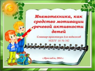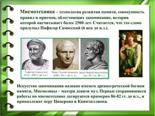 Документ описывает мнемотехнику как метод развития памяти и речевой активности у детей в дошкольных учреждениях, включая ее историю и цели. Особое внимание уделяется использованию мнемотаблиц для обучения детей с использованием визуальных образов и схем. В результате применения мнемотехники увеличивается словарный запас детей, развивается их речь и мелкая моторика.