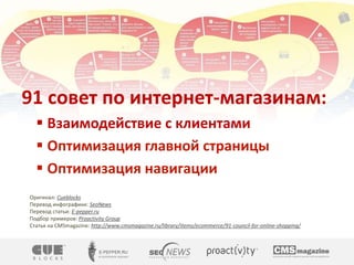 Документ содержит 91 совет по оптимизации интернет-магазинов, охватывающий улучшение взаимодействия с клиентами, оптимизацию главной страницы и навигации. Включены рекомендации по использованию опросов, онлайн-консультантов и аналитических инструментов для повышения продаж и удобства использования сайта. Также подчеркивается важность понятной структуры категорий и использования пользовательской аналитики для принятия основанных на данных решений.