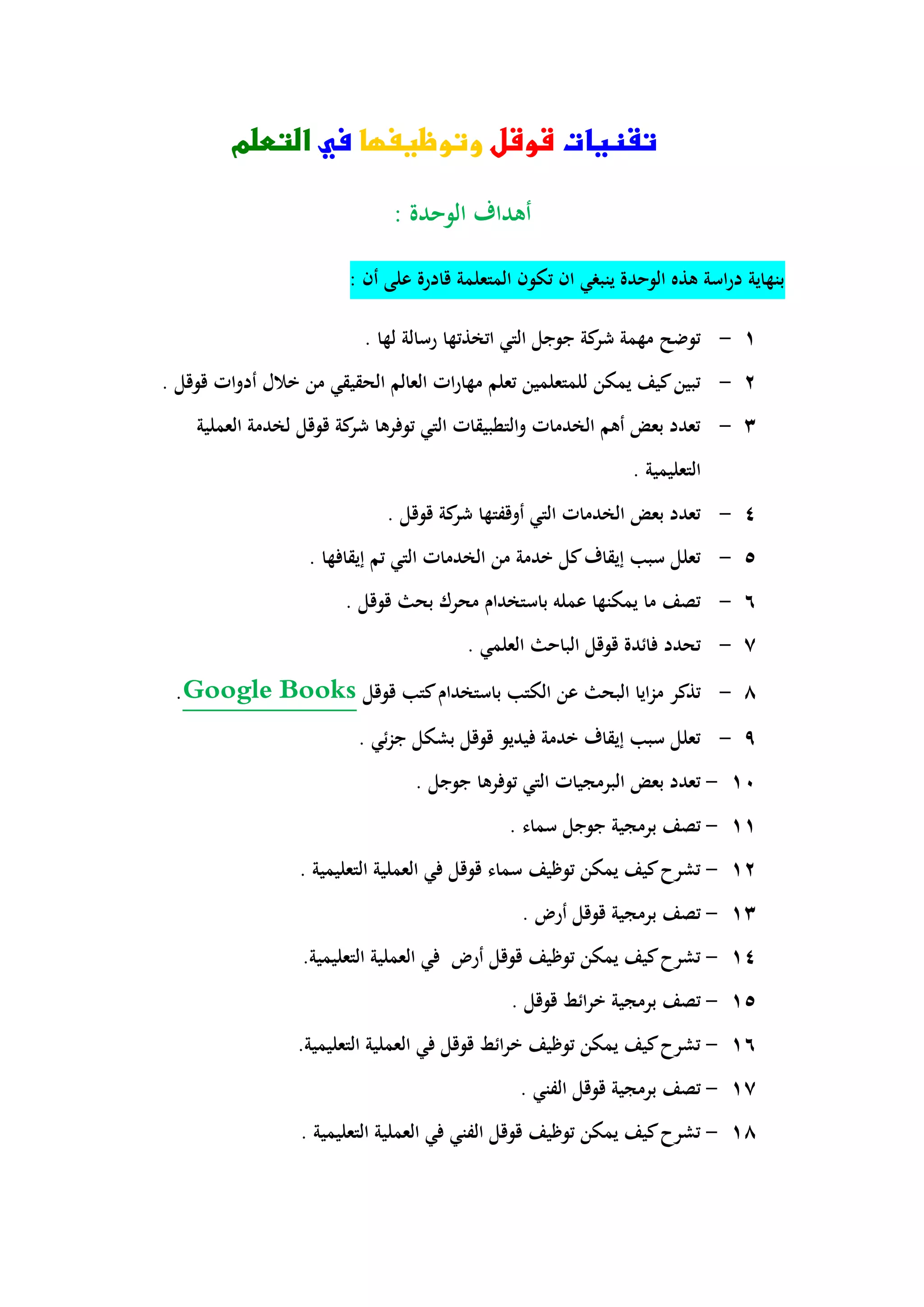 يتناول المستند تقنيات قوقل وكيفية استخدامها في التعلم، موضحًا أهداف الوحدة التي تشمل مهام مثل تحديد رسائل شركة جوجل، التعرف على الأدوات التعليمية، وخدمات قوقل المختلفة. كما يتضمن أنشطة لمناقشة وإعداد ورقات عمل حول استخدامات قوقل في التعليم والعوائق المحتملة في ذلك. يهدف إلى تمكين المتعلمين من استخدام أدوات قوقل لتعزيز مهاراتهم التعليمية.