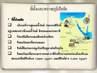 ที่ตั้ง 2.1.1 เนื่องจากหิมะละลายในเขตที่ราบสูงเอธิโอเปีย ท้าให้ บริเวณแม่น้้าไนล์มีดินตะกอนมาทับถมจึงเป็นพื้นที่มีความอุดมสมบูรณ์ 2.1.2 มีความได้เปรียบทางธรรมชาติ เนื่องจากประเทศอียิปต์ เป็นดินแดนที่ล้อมรอบด้วยทะเลทรายท้าให้มีปราการธรรมชาติในการ ป้องกันศัตรูภายนอก