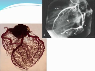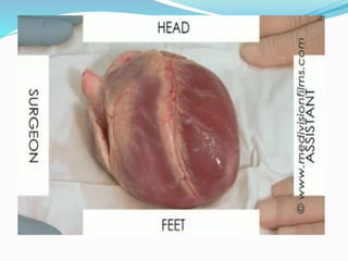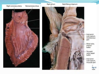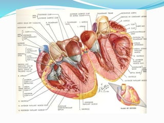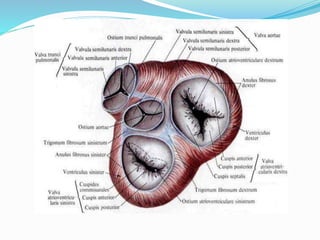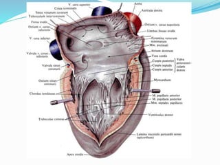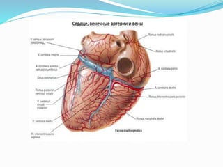 Документ представляет собой детализированное описание анатомии сердца, включая его камеры, клапаны, артерии и вены. Указаны ключевые структуры, такие как предсердия, желудочки, сосочковые мышцы и различные типы клапанов. Описываются также венозные системы сердца и важные анатомические маркеры.