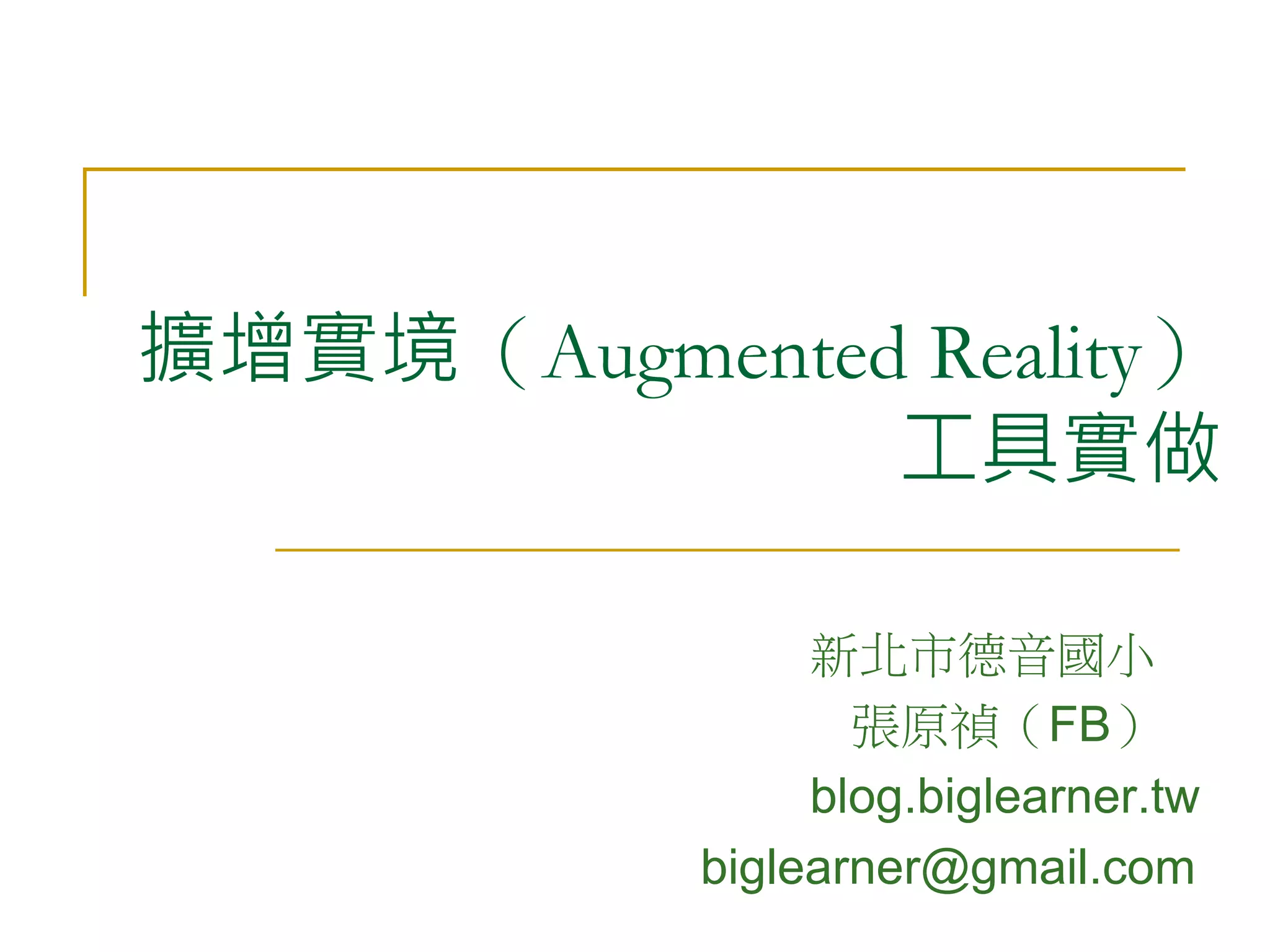 本文件探讨了在新北市德音国小实施增强现实(AR)工具的经验和应用,强调了AR在教育中的创新特性和相对优势。它介绍了一些易于使用的AR应用程序,支持多媒体学习及主动探究。作者建议通过AR技术提升课堂互动和学习情境,扩大教育资源的获取方式。