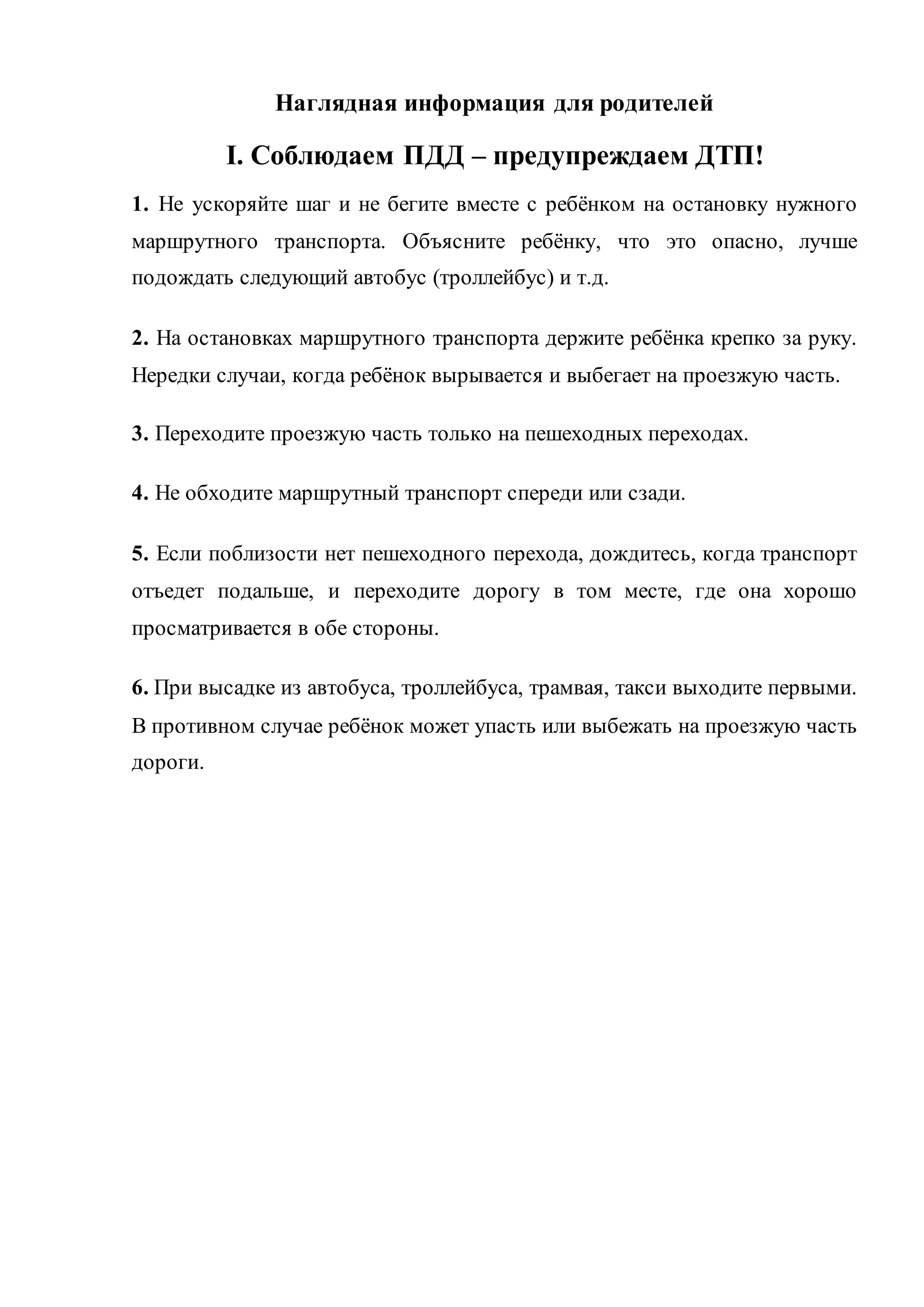 Документ содержит рекомендации для родителей по обеспечению безопасности детей на дороге и в общественном транспорте. В нем указаны правила поведения, которые дети должны усвоить до начала школьного обучения, включая соблюдение ПДД, использование ремней безопасности и внимание к окружающей среде. Родителям предлагается активно обучать детей безопасному поведению, подавая собственный пример.