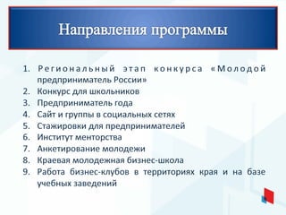 Документ описывает регулярные мероприятия, направленные на поддержку предпринимателей, включая ежемесячные мастер-классы по различным темам, еженедельные бизнес-игры для практики навыков и круглые столы с представителями администрации и банков. Основная цель этих мероприятий — обмен опытом и развитие навыков у участников. Также предусмотрены тренинги, проводимые по мере необходимости.