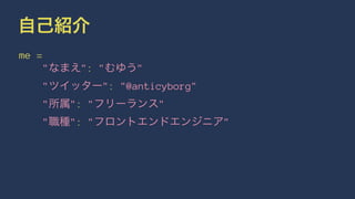 "なまえ": "むゆう" "ツイッター": "@anticyborg" "所属": "フリーランス" "職種": "フロントエンドエンジニア"