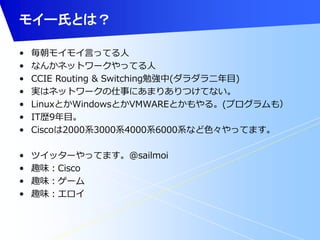 • なんかネットワークやってる人 • CCIE Routing & Switching勉強中(ダラダラ二年目) • 実はネットワークの仕事にあまりありつけてない。 • LinuxとかWindowsとかVMWAREとかもやる。(プログラムも) • IT歴9年目。 • Ciscoは2000系3000系4000系6000系など色々やってます。 • ツイッターやってます。@sailmoi • 趣味:Cisco • 趣味:ゲーム • 趣味:エロイ