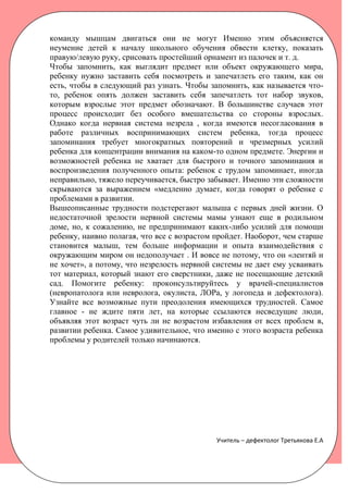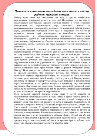Документ обсуждает познавательную деятельность детей и причины медленного усвоения информации, связывая это с незрелостью нервной системы и недостаточной работой органов чувств. У детей с проблемами в развитии появление заинтересованности в окружающем мире затруднено, что требует многократных усилий для запоминания и понимания речи. Рекомендуется обращаться к врачам-специалистам для поиска путей преодоления трудностей, не откладывая помощь до достижения пяти лет.