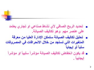 تتناول الوثيقة تكاليف الصيانة وتأثيرها على الربح الصافي لأي نشاط صناعي أو تجاري وتفصيل التكاليف المباشرة وغير المباشرة. كما يناقش كيفية تبويب تكاليف الصيانة، وتحليل الانحرافات في المصروفات بهدف تحقيق الرقابة الإدارية الفعالة. بالإضافة إلى ذلك، يتناول أهمية تحديد الميزانية المخصصة للصيانة وتقديم تقارير دورية لمتابعة الأداء وتحليل الفروقات بين التكاليف المقدرة والحقيقية.