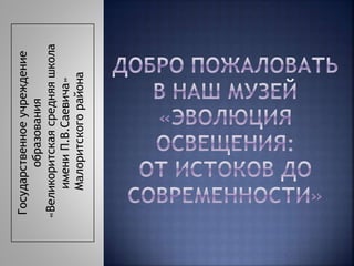 Документ обсуждает историческое развитие осветительных приборов, начиная с древних факелов и светильников, и заканчивая современными светодиодными лампами. Описаны различные источники света, такие как свечи, керосиновые и электрические лампы, с акцентом на их происхождение и эволюцию технологии. Также подчеркивается важность энергоэффективности современных решений для городского освещения.