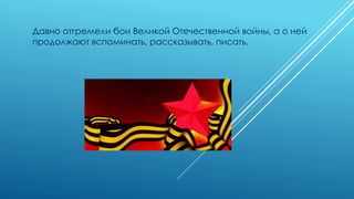 Документ представляет обзор книг-юбиляров о Великой Отечественной войне, выпущенных в 2014 году, в которых очевидцы и фронтовики делятся своими воспоминаниями. Особое внимание уделяется трудам Сергея Смирнова и Бориса Васильева, которые рассказывают о героизме солдат и судьбах фронтовиков после войны. Обзор также посвящён Дню неизвестного солдата и подчеркивает важность сохранения памяти о героях войны.