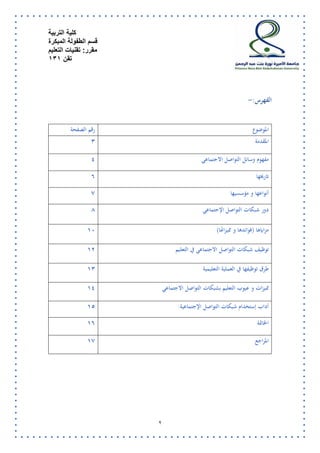 تناقش الوثيقة دور شبكات التواصل الاجتماعي في تعليم الأطفال، وتستعرض مفهومها وتاريخها وأنواعها وفوائدها. كما تشير إلى إمكانية توظيفها في العملية التعليمية من خلال تعزيز التواصل والمشاركة الفعالة، رغم التحديات مثل الإدمان الإلكتروني. تُبرز الوثيقة الأهمية المتزايدة لهذه الشبكات في العصر المعلوماتي وكيف يمكن أن تنعكس بشكل إيجابي على التعلم.