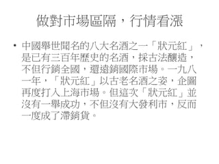 本文探讨了市场区隔与目标营销策略的重要性,通过'状元红'的案例说明了目标市场的选择和产品定位。文中详细分析了市场区隔的步骤、变量以及评估策略,同时强调促销策略在营销中的作用和必要性。有效的市场调研和消费者分析是制定成功营销策略的关键。