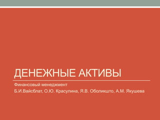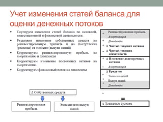 Документ описывает финансовый менеджмент и методы оценки денежных потоков, включая модель Баумоля и модель Миллера-Орра. Модель Баумоля предполагает, что предприятие поддерживает оптимальный уровень денежных средств, перераспределяя их через краткосрочные ценные бумаги в зависимости от потребностей. Модель Миллера-Орра описывает динамику остатка средств, при которой предприятие регулирует активы в зависимости от верхнего и нижнего пределов остатков на счете.