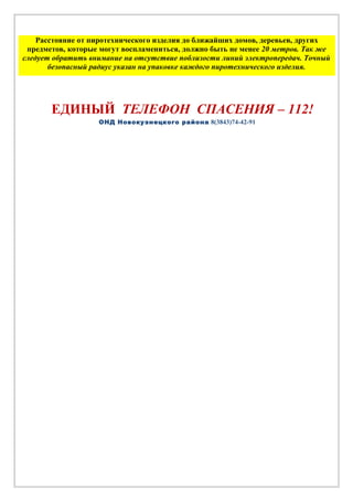 В документе изложены меры безопасности при использовании пиротехнических изделий во время новогодних праздников. Напоминается о необходимости соблюдения инструкций по запуску фейерверков, а также о запрете запуска пиротехники в состоянии алкогольного опьянения и о минимальном безопасном расстоянии до зданий. Также указаны контактные номера для экстренной помощи.