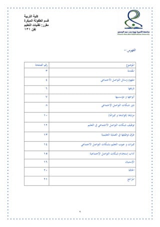 تناقش الوثيقة دور شبكات التواصل الاجتماعي في التعليم، مستعرضة مزاياها وعيوبها. تشير إلى أن هذه الوسائل أصبحت أداة تعليمية هامة، تمكن الأفراد من التفاعل ومشاركة المعلومات بسهولة. كما يتناول المحتوى تطور هذه الشبكات وأثرها على التواصل الاجتماعي والسياسي.