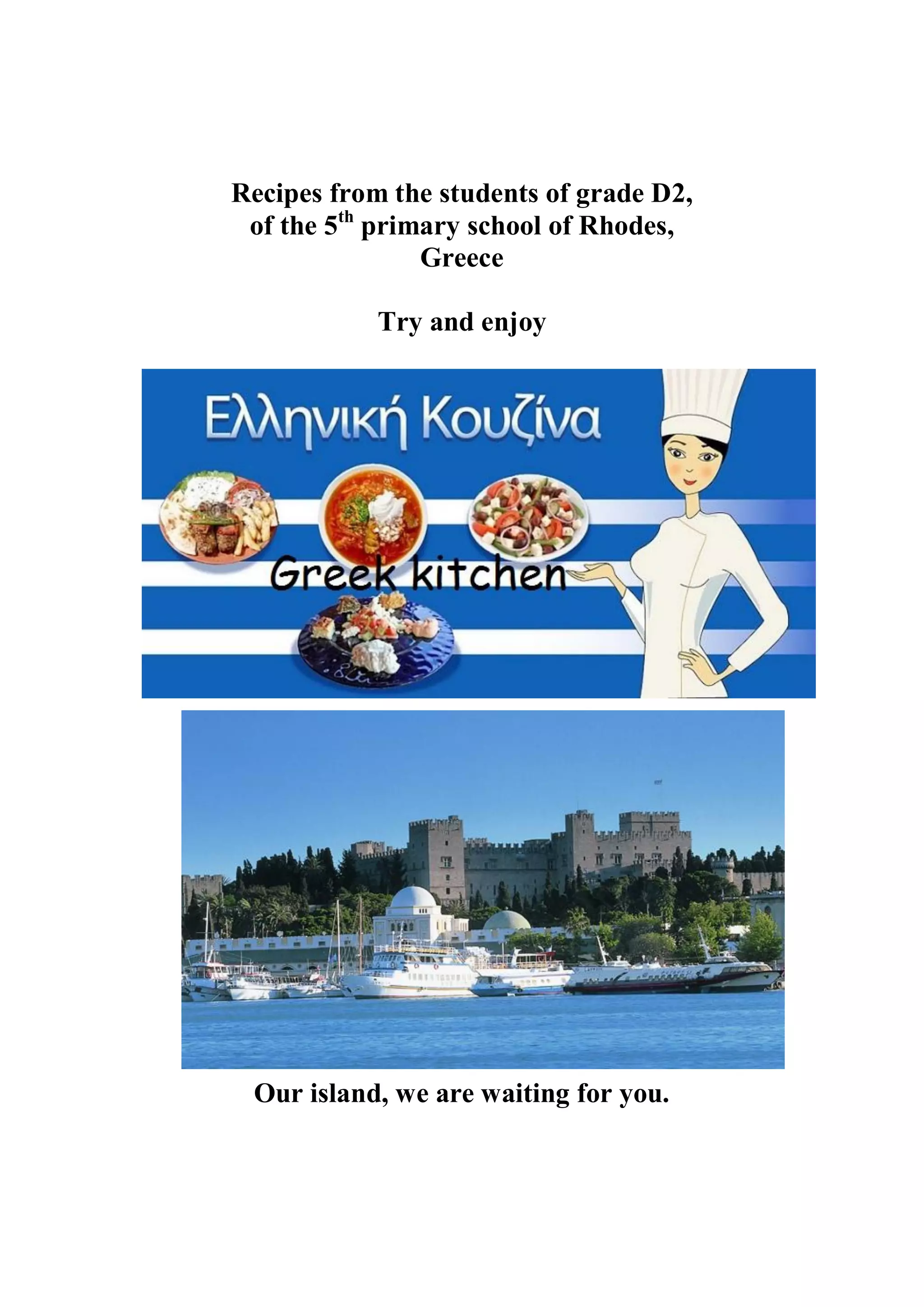 This document contains recipes from students in Rhodes, Greece. It includes dishes like Giouler's fresh fish, Matina's Greek salad, Flora's string beans with pumpkin, Anastasia's moussaka, and others. Each recipe provides ingredients and instructions for traditional Greek and international dishes.