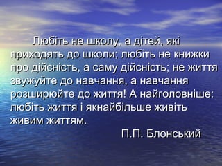 аа ддііттеейй,, яяккіі ппррииххооддяяттьь ддоо шшккооллии;; ллююббііттьь ннее ккнниижжккии ппрроо ддііййссннііссттьь,, аа ссааммуу ддііййссннііссттьь;; ннее жжииттттяя ззввуужжууййттее ддоо ннааввччаанннняя,, аа ннааввччаанннняя ррооззшшииррююййттее ддоо жжииттттяя!! АА ннааййггооллооввнніішшее:: ллююббііттьь жжииттттяя іі яяккннааййббііллььшшее жжииввііттьь жжииввиимм жжииттттяямм.. ПП..ПП.. ББллооннссььккиийй